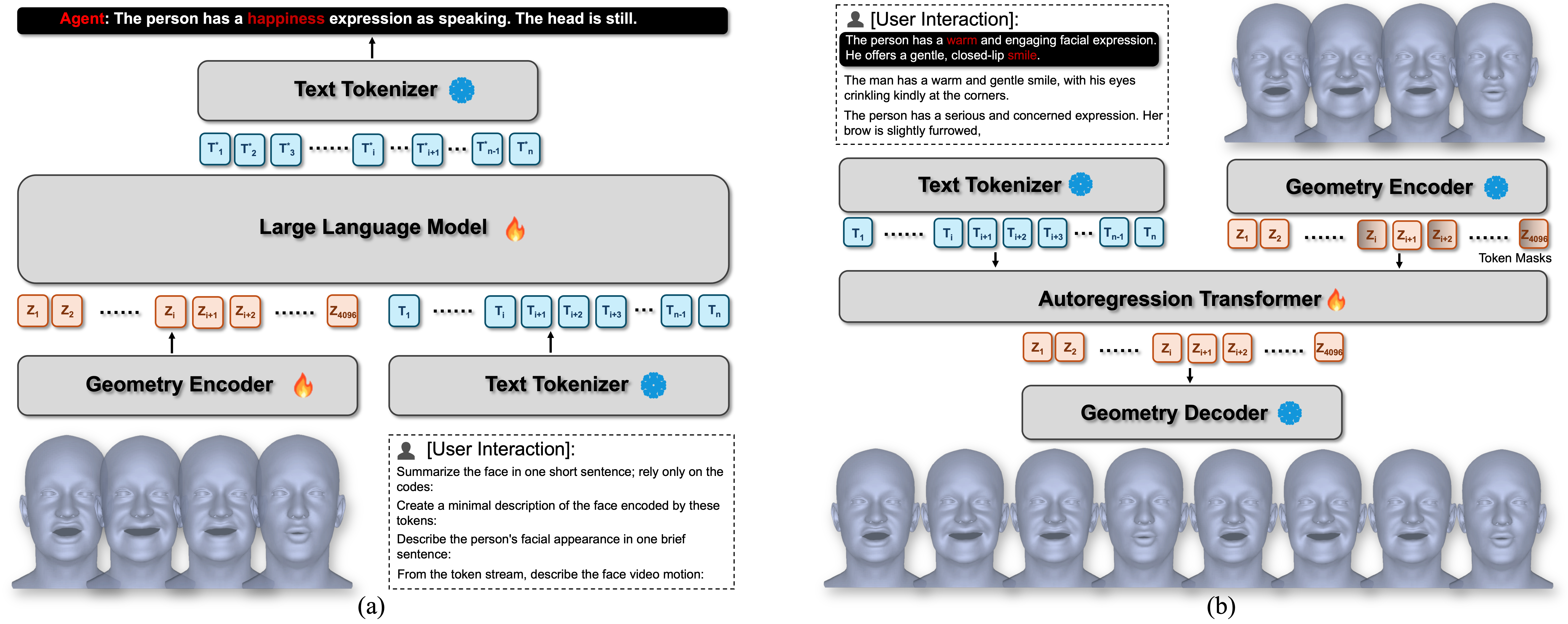 Text-guided human body animation has advanced rapidly, yet facial animation lags due to the scarcity of well-annotated, text-paired facial corpora. To close this gap, we leverage foundation generative models to synthesize a large, balanced corpus of facial behavior. We design prompts suite covering emotions and head motions, generate about 80 hours of facial videos with multiple generators, and fit per-frame 3D facial parameters, yielding large-scale (prompt and parameter) pairs for training. Building on this dataset, we probe language models for bidirectional competence over facial motion via two complementary tasks: (1) Motion2Language: given a sequence of 3D facial parameters, the model produces natural-language descriptions capturing content, style, and dynamics; and (2) Language2Motion: given a prompt, the model synthesizes the corresponding sequence of 3D facial parameters via quantized motion tokens for downstream animation. Extensive experiments show that in this setting language models can both interpret and synthesize facial motion with strong generalization. To best of our knowledge, this is the first work to cast facial-parameter modeling as a language problem, establishing a unified path for text-conditioned facial animation and motion understanding.